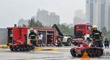 8月10日上午,河南省消防部队供水能力现场会在洛阳新区体育广场举行,公司自主研发的2台消防机器人参加了现场综合演练。